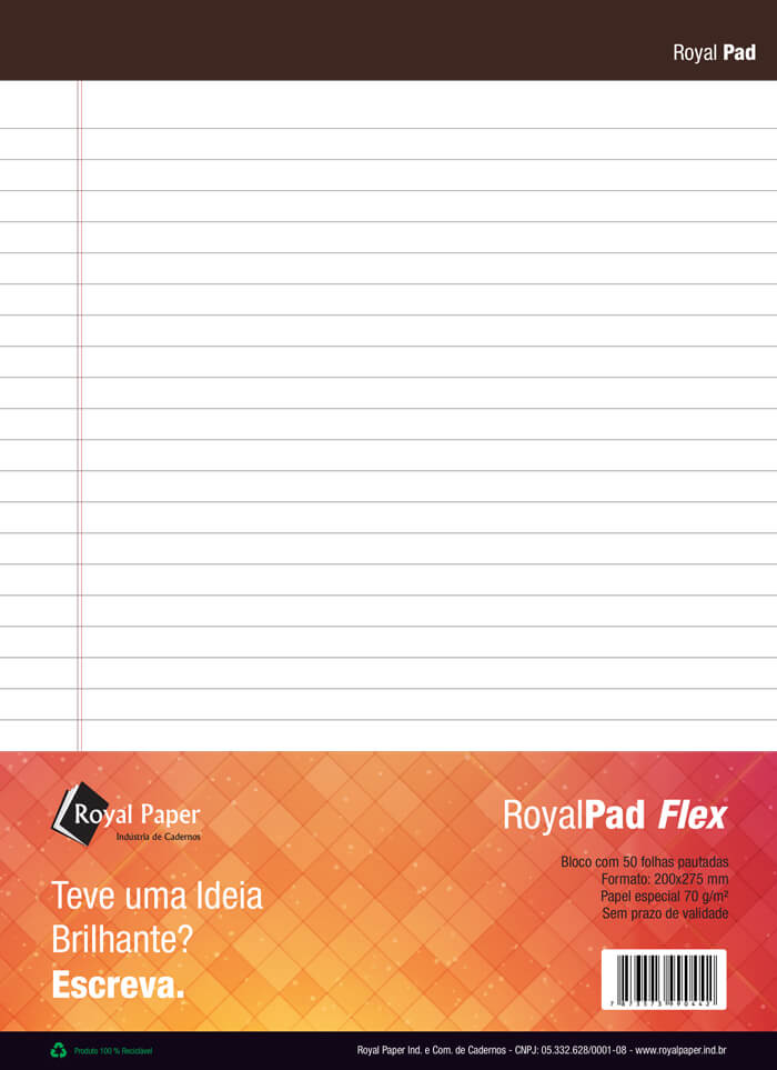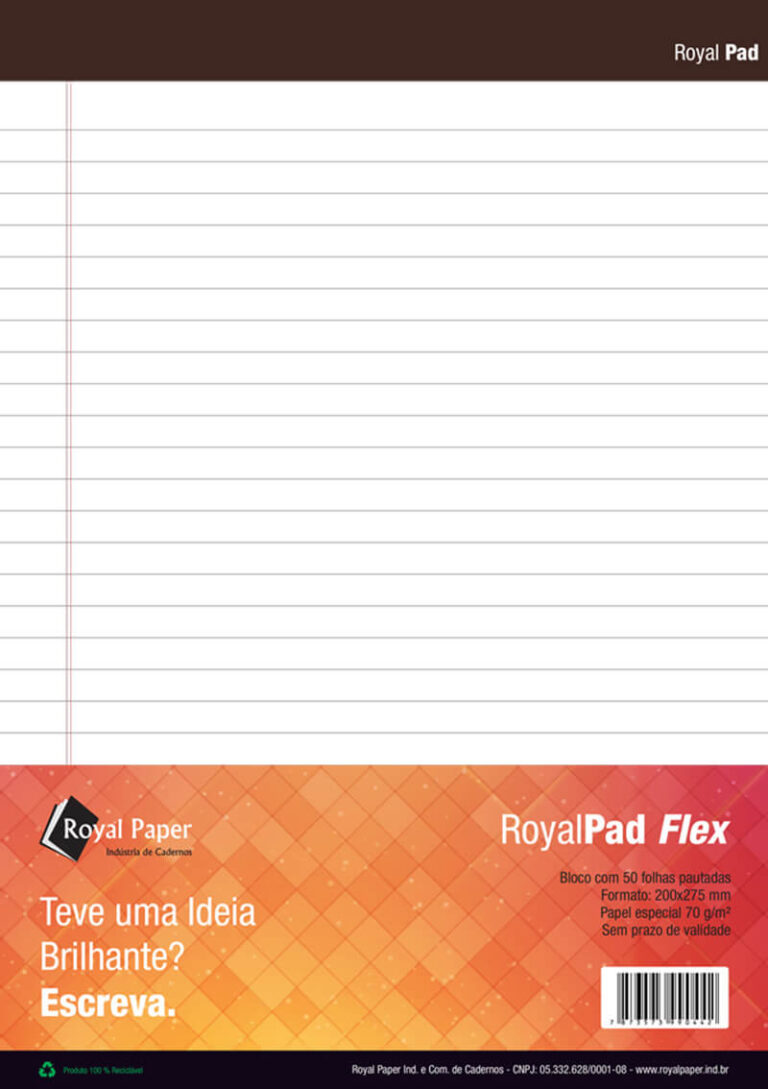 Os blocos Royal Pad Flex são ideais para quem busca qualidade e elegância no dia a dia. Produzidos com papel especial Avena 80 g/m², garantem uma escrita suave e de alta durabilidade. Com 50 folhas pautadas frente e verso, são perfeitos para anotações, estudos e uso corporativo.